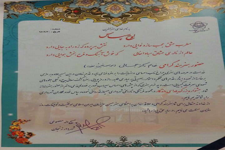 اهدا لوح تقدیر در نخستین جشنواره نشان مسئولیت اجتماعی استانی توسط آقای دکتر شهرام دبیری معاون پارلمانی ریاست جمهوری به خانم دکتر فرح جمالی، مدیرعامل موسسه خیریه روزبه